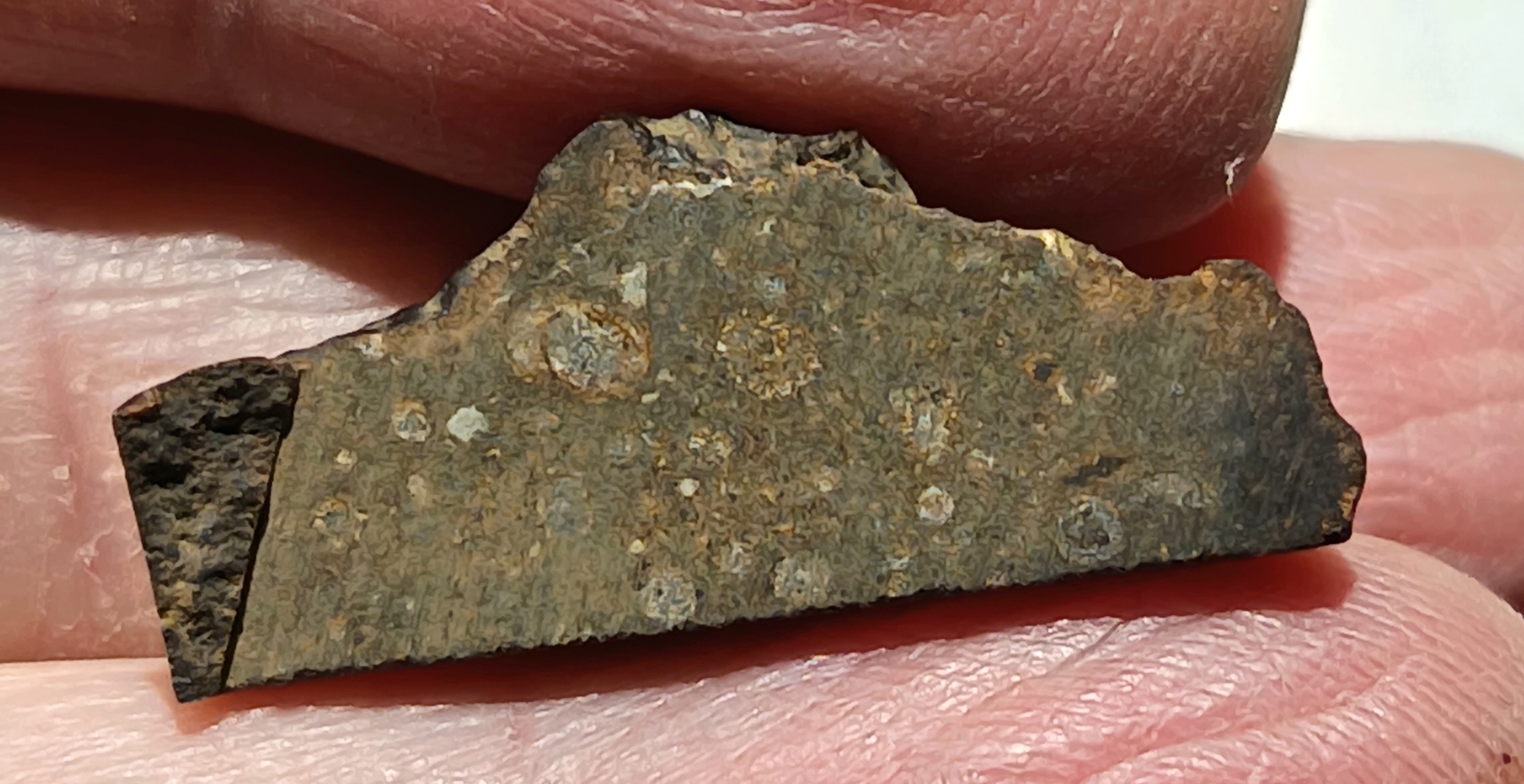 NWA 18248 - Algeria - Condrite carbonacea CK3 Anno ritrovamento: 2025 Quantità recuperata: 558g Spettacolare e rara meteorite, condrite carbonacea tipo CK, raro sottogruppo. Condrule ben visibili come in foto, pochissima alterazione e nessuna vena di shock, materiale compatto. Analizzata, classificata e pubblicata sul Bulletin con analisi dettagliate. Tutta la meteorite è in mio possesso al netto del materiale utilizzato per le analisi. Peso: 3,20g (quarto di taglio) |